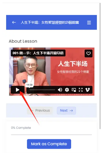 1.在課程頁面,找到視頻播放器並點撃 播放按鈕,始看課程 ▫